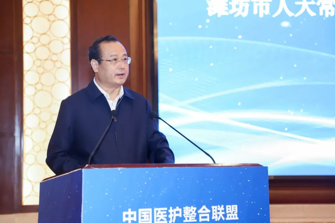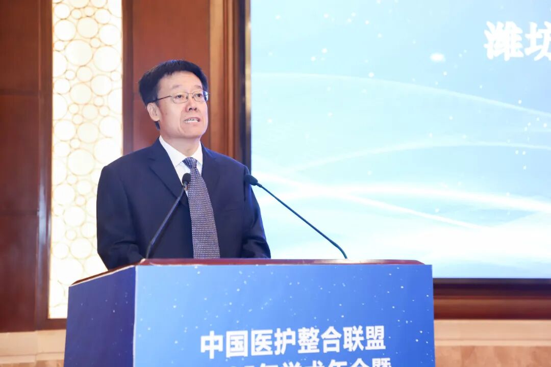 潍坊护理职业学院党委书记崔照忠在大会上致辞。他表示,2018年在樊代明院士的高瞻远瞩与鼎力支持下,中国医护整合联盟应运而生。自成立以来,中国医护整合联盟始终秉持“整合医学”理念,聚焦复合型医护人才培养,深耕不辍医护整合,取得了丰硕成果。学院将“整合医学”理念深度融入办学实践,在创新构建“三维三融”人才培养体系、产教融合、突出中医药办学特色等方面取得了显著成绩。他表示,学院将充分吸收年会的智慧成果,融入“双校双院”协作提升行动,助力潍坊打造山东医学新高地,服务全省卫生健康事业高质量发展,与联盟成员单位一起为建设教育强国、健康中国贡献更多“联盟智慧”,注入更强“潍护力量”!