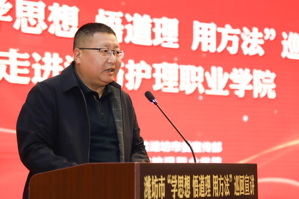 为深入学习贯彻习近平新时代中国特色社会主义思想,推动党的创新理论进校园、进课堂、进头脑,11月3日下午,潍坊市“学思想 悟道理 用方法”巡回宣讲活动走进潍坊护理职业学院,为师生带来一场有深度、有温度的理论宣讲和精神洗礼。潍坊市宣传文化服务中心副主任王海军,学院党委副书记苏建福,青州市委宣传部副部长王庆周,学院党委委员、宣传部部长郭兴华出席活动。