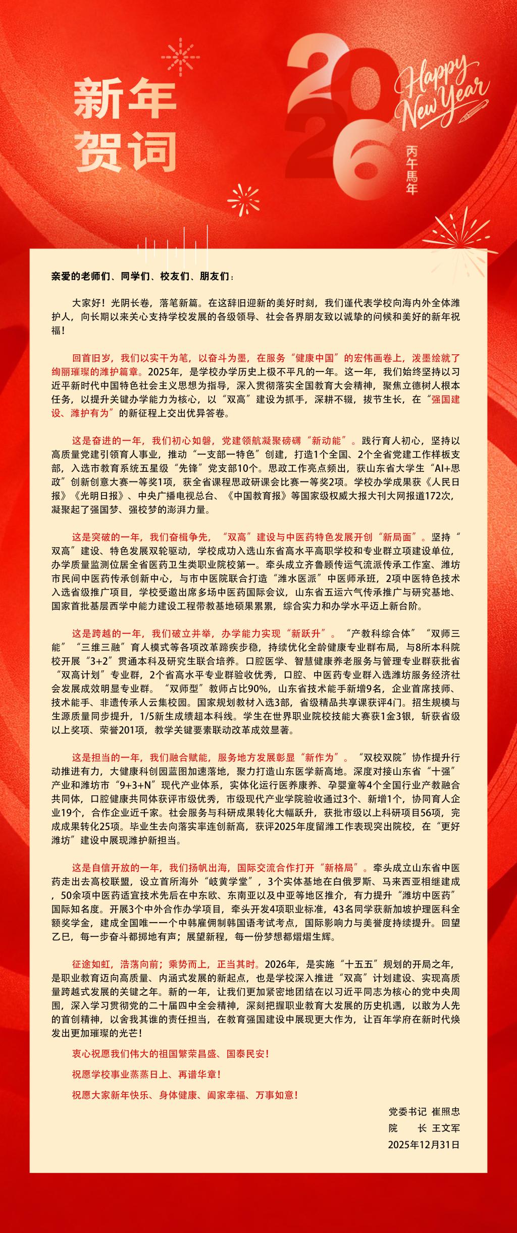 潍坊护理职业学院2026年新年贺词