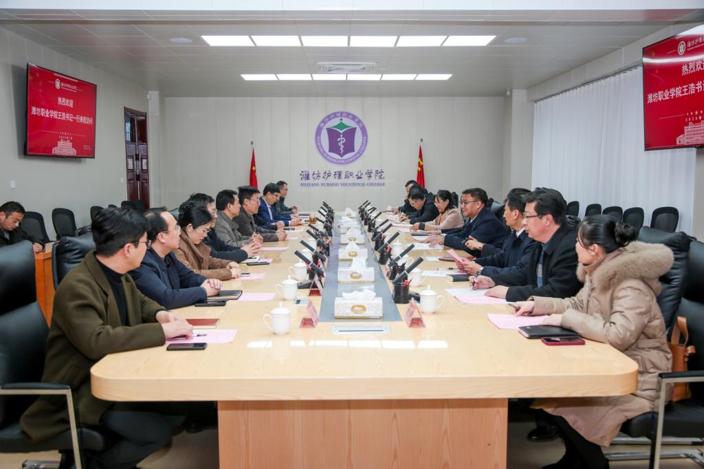 1月6日,潍坊职业学院党委书记王浩,党委副书记、院长韩瑞东一行11人来校考察交流。学校党委书记崔照忠出席活动。校领导苏建福、窦忠伟、郭兴华及有关职能处室、院系负责人参加。