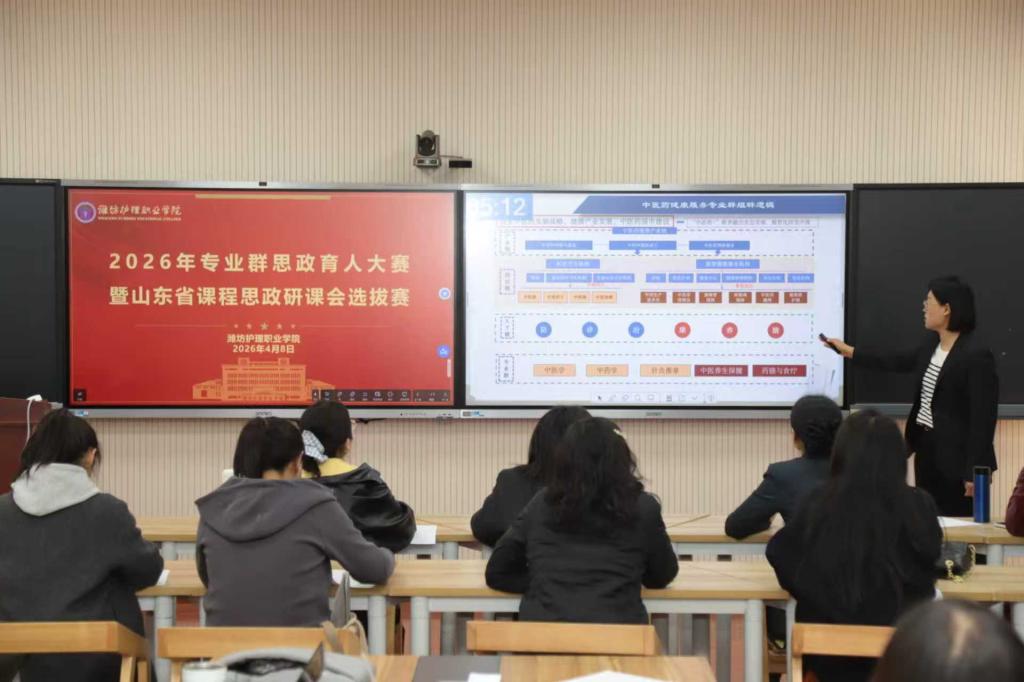 为全面落实立德树人根本任务,进一步推进学校专业群思政、专业思政和课程思政协同建设,健全“专业群—专业—课程”一体化思政育人体系,4月8日上午,潍坊护理职业学院2026年专业群思政育人大赛暨山东省课程思政研课会选拔赛在图书馆103教师成长研习坊举行。