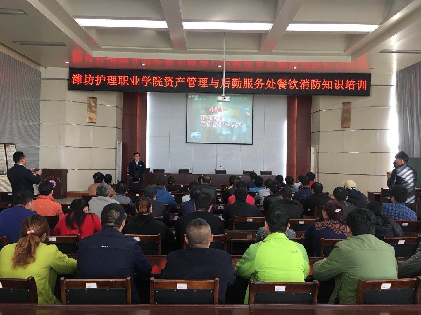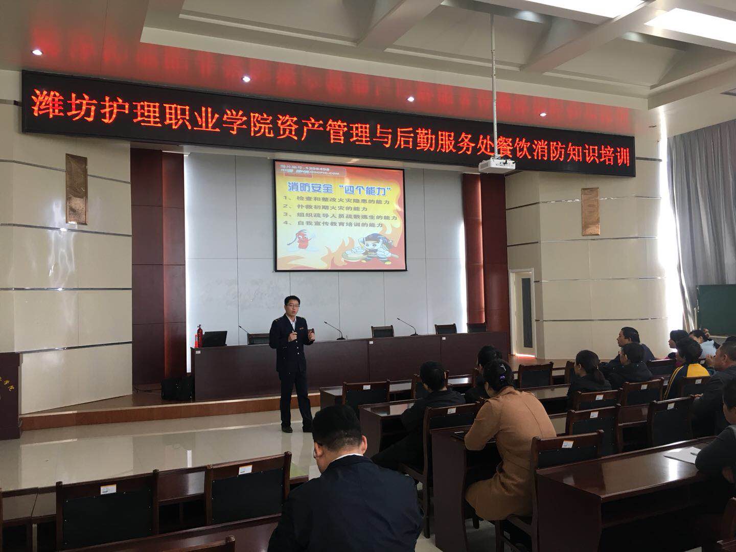 10月19日上午9:00,潍坊护理职业学院资产管理与后勤服务处邀请市消防支队王教官在学院二号教学办公楼会议室成功举办了餐饮消防安全培训,后勤领导及各餐饮公司人员参加了培训。