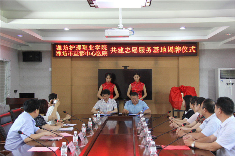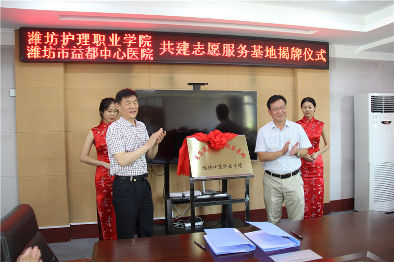 5月29日,潍坊护理职业学院与潍坊市益都中心医院共同举行“医路健行”志愿服务基地揭牌仪式,正式拉开共建大学生志愿服务基地的帷幕。潍坊护理职业学院纪委书记王坤法、副院长苏建福,潍坊市益都中心医院党委副书记、副院长王建波等领导出席仪式并为志愿服务基地揭牌。