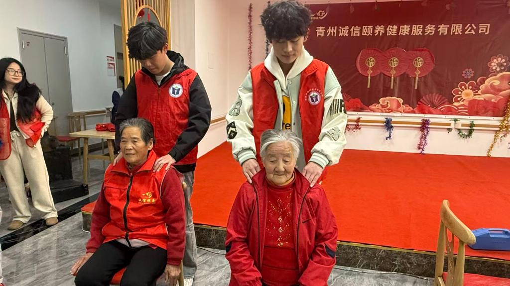 在温馨的歌声中,志愿者们主动走到老人们身后,为他们按摩肩膀、揉捏手臂。“爷爷,这个力度您看合适吗?”“奶奶,这里酸不酸,我再轻一点。”温柔的询问声不断响起。起初有些拘谨的老人,在志愿者轻柔的力道中渐渐放松下来,一位奶奶舒服地眯起眼睛,轻声呢喃:“就像我孙女在家给我捶背一样,心里暖暖的。”简单的一句话,让志愿者们心头一热——老人们渴望的不仅是身体的放松,更是这份如同亲人般的贴近与陪伴。重阳节里,指尖传递的温度,融化了陌生的隔阂,让养老院满是家的温馨。