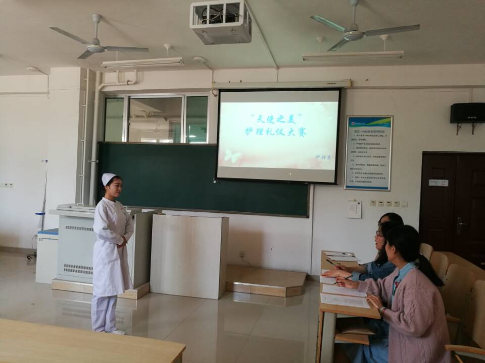为庆祝5.12国际护士节,继承和弘扬“南丁格尔”精神,培养高素质护理人才,展现在校护生的风采,塑造良好护生形象,提升护生气质以及人文素养,护理系于5月9日下午在护训楼举办了以“天使之美”为主题的2018年度护理系护理礼仪大赛。共60名学生参赛,基础护理和护理人文教研室曹卿、王庆平、高青老师出席比赛并担任评委。
