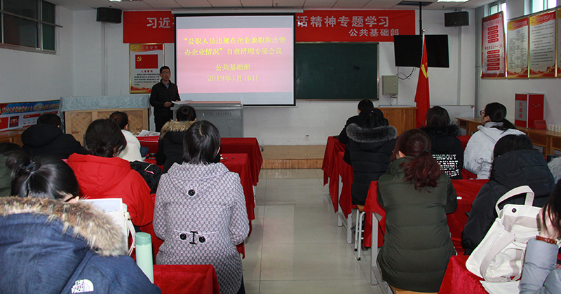 按照市委组织部《关于对公职人员违规到企业兼职、出资办企业情况进行自查自纠的通知》要求,公共基础部于1月16日在图书馆B102会议室召开“公职人员违规在企业兼职和出资办企业情况”自查清理专项会议,公共基础部全体教师参加,支部专职副书记张杨主持会议。