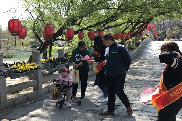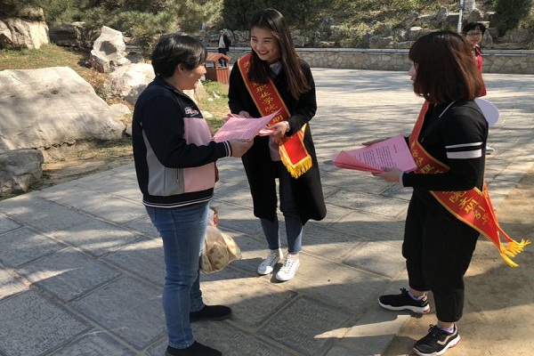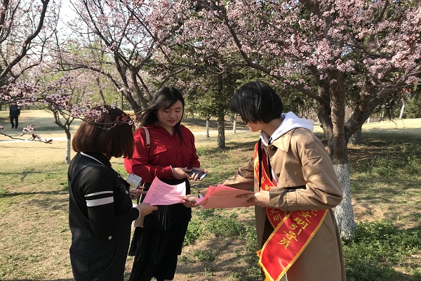活动伊始,学院学生工作处的老师们首先对志愿者学生们进行了简短的培训,强调了此次活动的注意事项。随后,志愿者们分批行动,向景区游客及附近居民发放了《文明旅游倡议书》,并向大家细致耐心地介绍文明赏花、文明出游的相关知识和内容,志愿者们号召大家积极践行《中国公民文明旅游公约》,文明踏青赏花,不践踏草坪,不攀折花木;爱护公共环境,不随地吐痰,不乱扔废弃物,爱护公共设施,不在树木、名胜古迹和公共设施上涂抹、刻画。整个下午志愿者们毫无怨言,辛勤付出,劝导市民和游客赏花爱花,规范个人行为,对不文明行为说不。