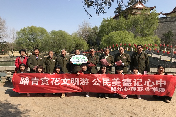 文明赏花,文明旅游,不仅仅是一个人素质的体现,更是一个城市文明程度的重要标志。随着清明假期的临近,市民出行旅游的高峰期即将到来,为广泛宣传、普及旅游知识,传播环保、低碳、绿色、文明出游新理念,倡导市民践行“踏青赏花文明游,公民美德记心中”,4月3日下午,潍坊护理职业学院组织师生建立志愿者队伍,到青州市范公亭风景区开展了“文明之春—踏青赏花文明游”为主题的宣传教育实践活动。