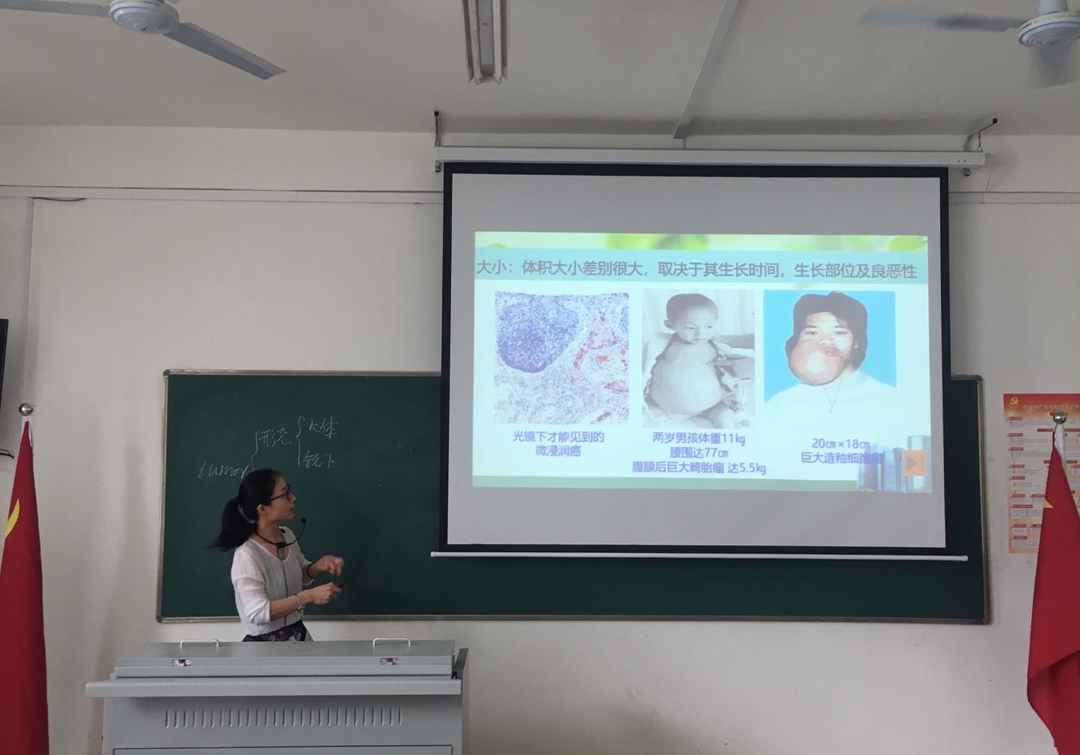“优秀教师示范课”是由病理教研室许婷婷老师进行展示,在此次讲课过程中她选取了《肿瘤》这一章节,主要采用了启发式教学方法,充分利用多媒体课件及视频,讲解了肿瘤的形态结构及生长方式,教学环节完整,给大家展示了一堂精彩的课堂教学,赢得各位老师一致好评。