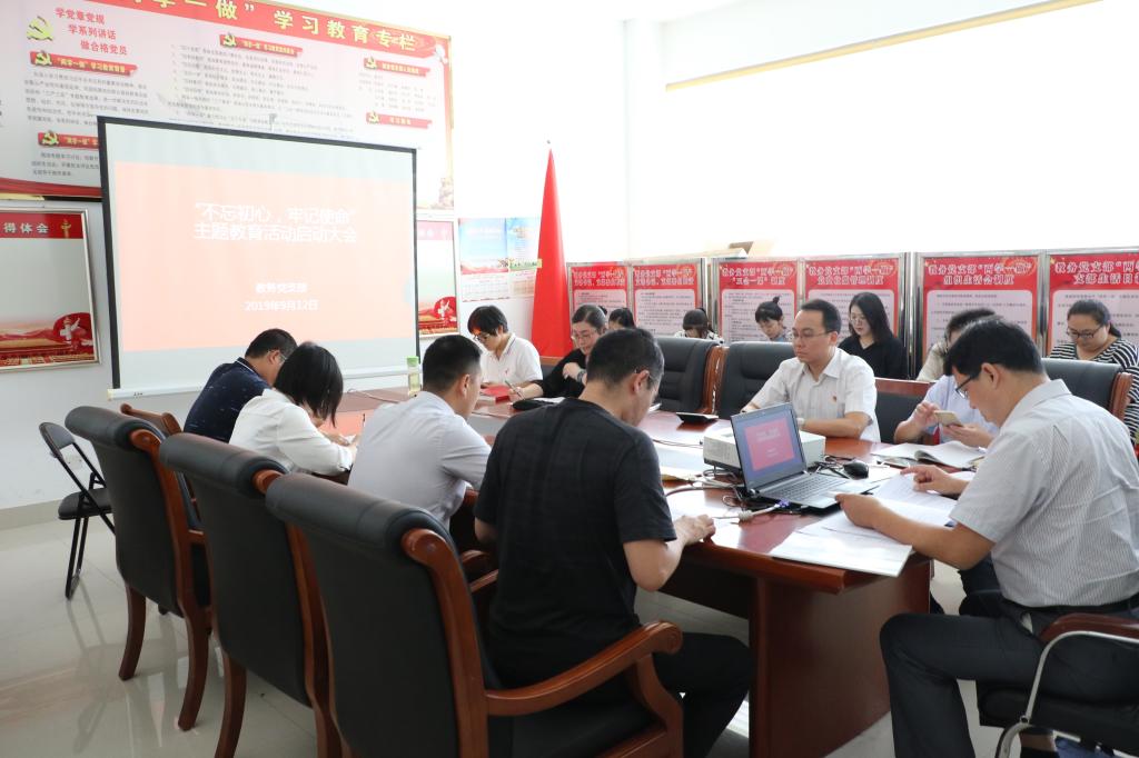 中国共产党为什么“能”?一个在成立时只有50多名党员却创造了举世瞩目的成就,一个根本原因就是中国共产党始终坚持以人民为中心,中国共产党人的初心就是为人民谋幸福。“不忘初心 牢记使命”主题教育启动会议于9月17日在教务党支部619室举行,会议由教务党支部书记郭兴华主持,教务处、科研处、图书馆全体党员、预备党员和入党积极分子参加,会议学习了相关文件,科研处处长马长松作表态发言。