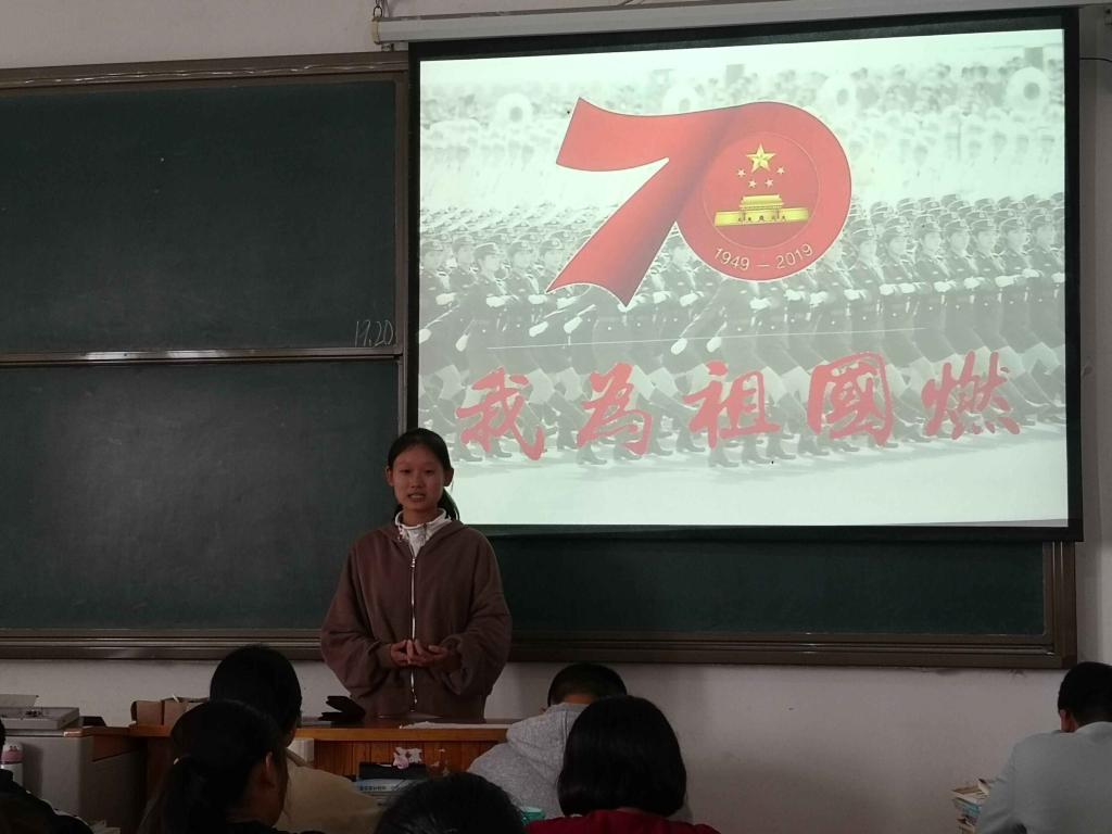 活动中,同学们都认真准备了讲稿、PPT和歌曲,积极登上讲台和大家分享自己为祖国骄傲的瞬间。从中国高铁、港珠澳大桥、大兴机场这些让人惊叹的“中国速度”,到也门撤侨、抗震救灾中最可爱的中国军人,每一个故事背后都凝聚着中国人民的泪水和血汗,体现着中华民族的不屈和奋进,课堂上多次响起热烈的掌声,很多同学激动的热泪盈眶。