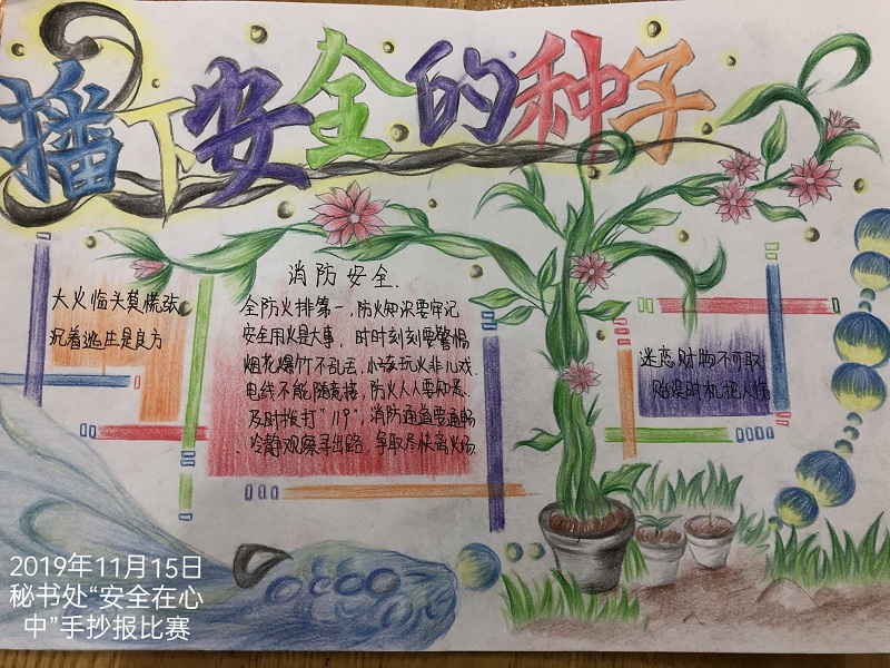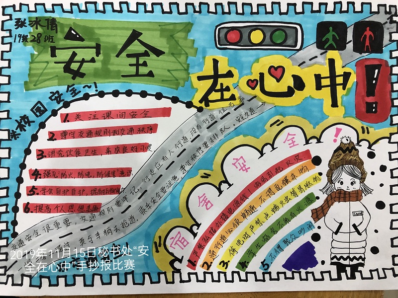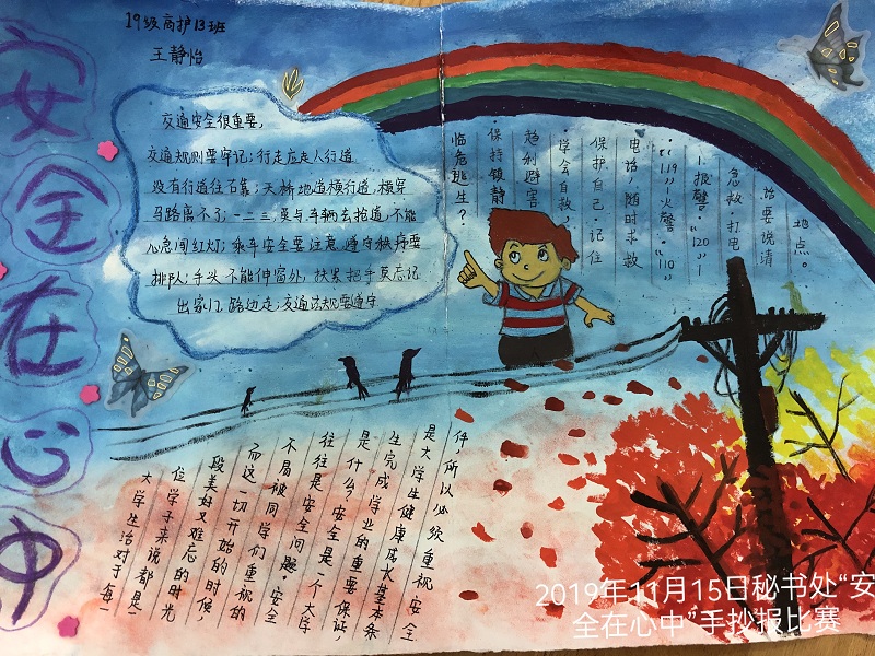 为了增强同学们的安全意识,建设安全校园,护理系在11月15日1号教学楼511教室开展“安全在心中”手抄报评选活动。同学们通过制作手抄报普及了校园安全知识,活动中19级高护13班的王静怡等人表现优异。