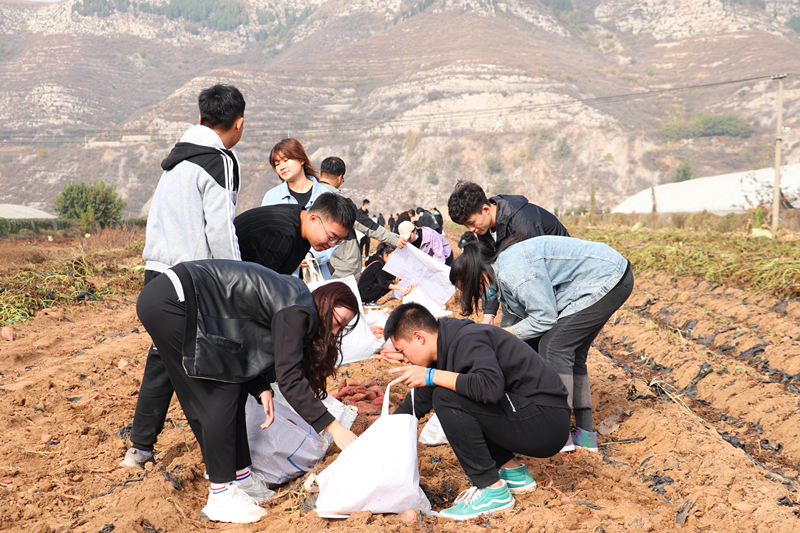 活动分为劳动实践——帮助村民收蜜薯和缅怀革命先烈两部分内容,益都校区教管中心学生科负责人刘峻齐、马克思主义教研部思政教师刘丹、辅导员纪冬梅带领学生会干部和白鸽天使志愿服务队参加此次社会实践活动。师生志愿服务队一行受到了驻村干部的热情接待。在长秋村红薯基地,同学们带着手套、铁铲、袋子等工具,有条不紊地分工合作挖红薯,并按照大小和质量进行分类包装,齐心协力将红薯搬运装车。师生们还积极响应消费扶贫的号召,以为师生代购的形式帮村民销售红薯和蜜薯,支持打赢脱贫攻坚战。